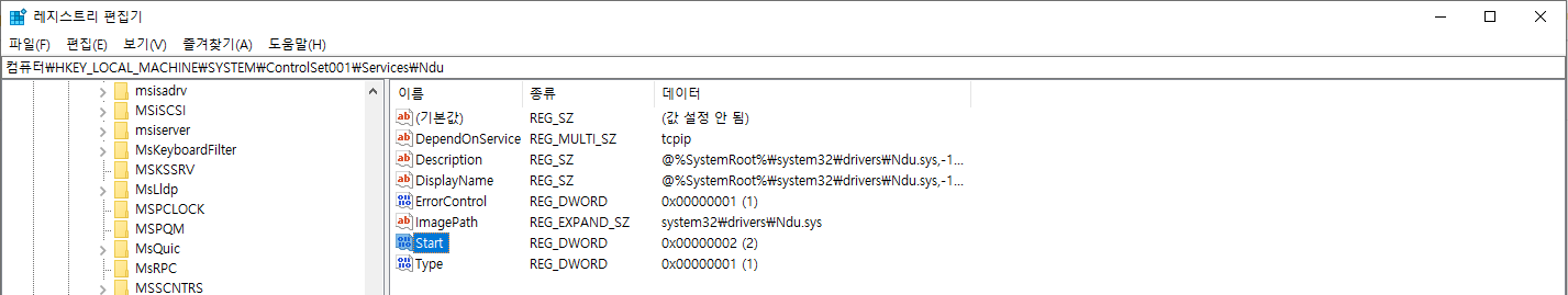 HKEY_LOCAL_MACHINE\SYSTEM\ControlSet001\Services\Ndu 경로로 이동해서 Start를 실행합니다.