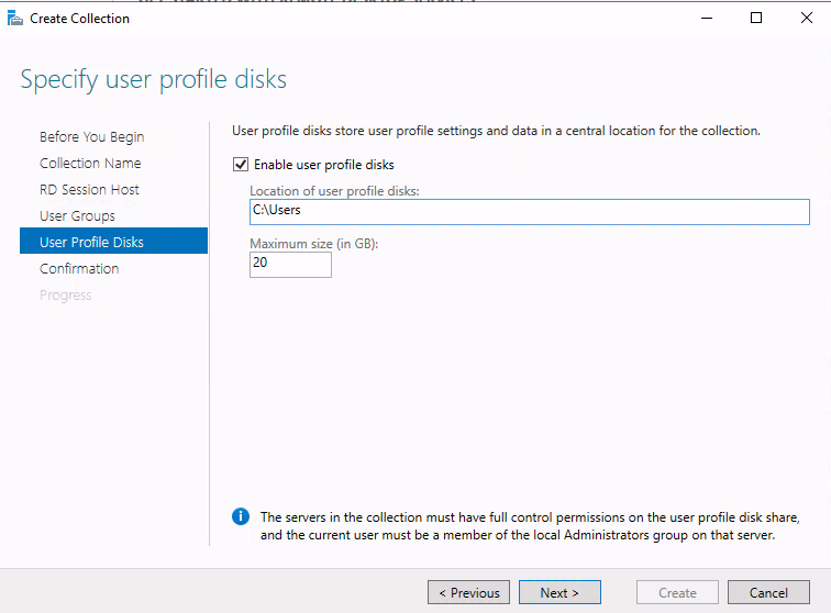 컬렉션의 서버는 사용자 프로필 디스크 공유에 대한 모든 제어 권한을 가지고 있어야 하며 현재 사용자는 해당
