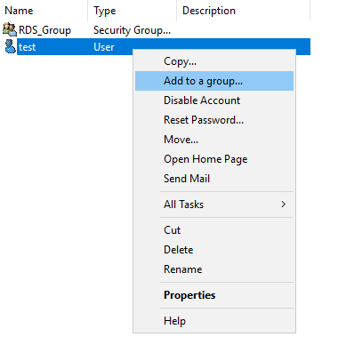 14) test계정 우클릭 후 Add to a group(그룹에 추가)를 선택합니다