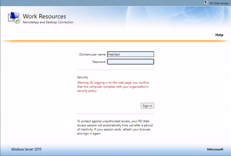 57) 호스트 PC에서 도메인/rdweb 으로 접속 (ex : https://rds.free.com/rdweb) 해서 그룹에 사용자 계정으로