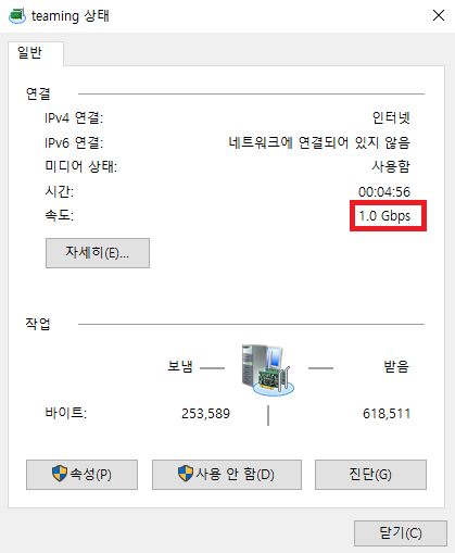 9) 어댑터 하나가 비활성화되고, 속도가 1.0Gbps로 감소되었지만, 네트워크는 정상적으로 사용됨을 확인할 수 있습니다.