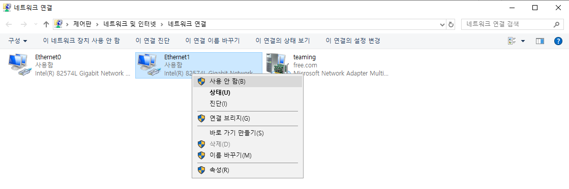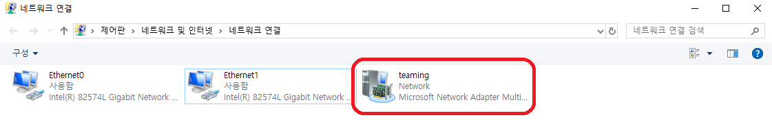 teaming 어댑터가 생김을 확인할 수 있습니다. teaming 어댑터를 실행합니다.