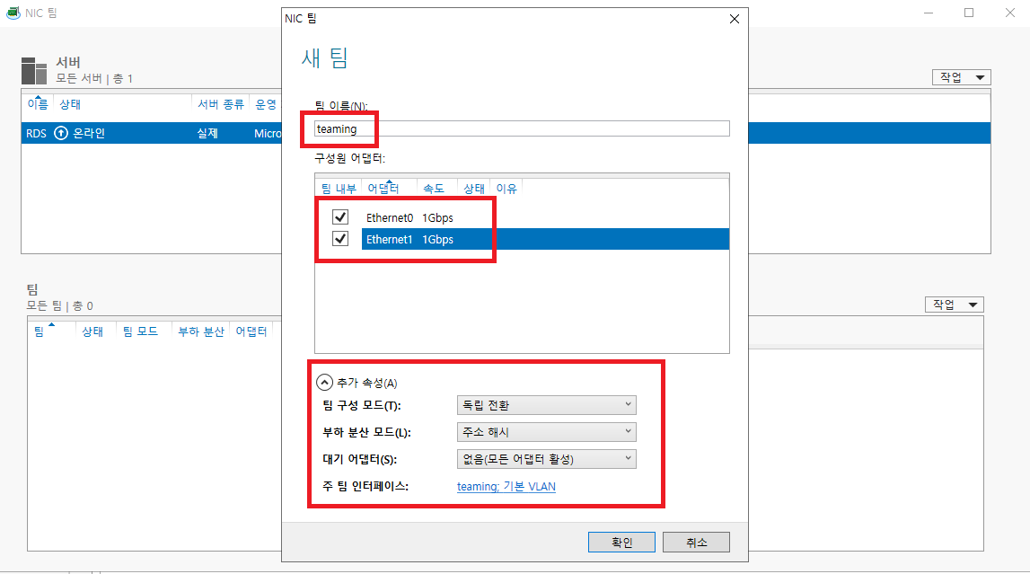 3) 팀 이름을 지정하고 네트워크 다중화로 사용할 어댑터를 선택 후 속성을 설정합니다.