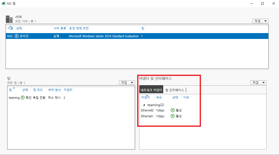 4) 어댑터 및 인터페이스에 teaming 그룹이 생성되었고 활성화 되었음을 확인할 수 있습니다.