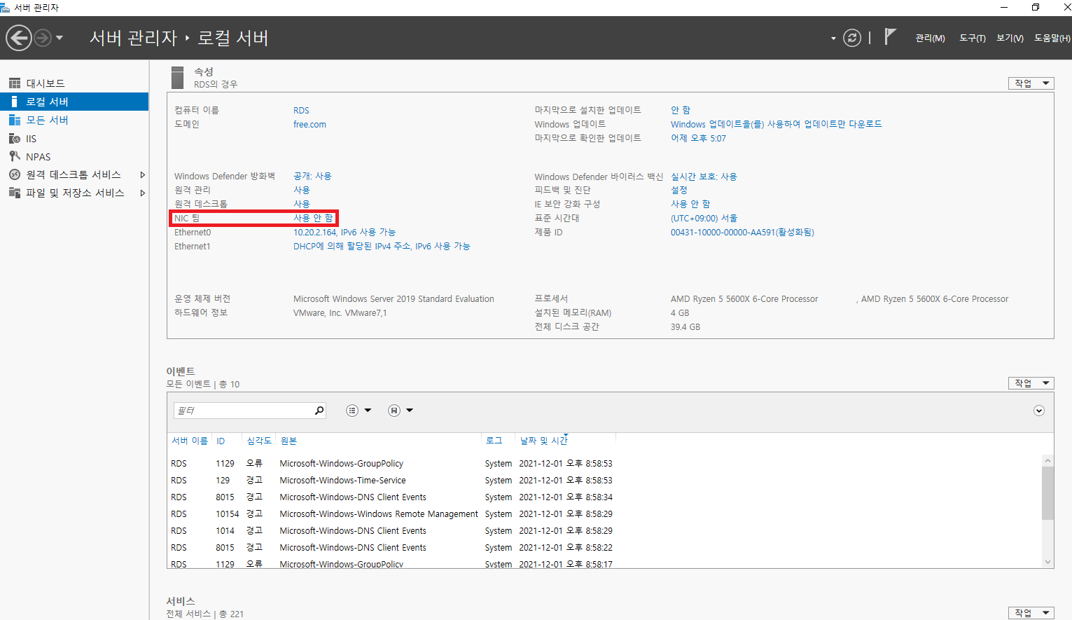 1) 서버관리자에서 로컬서버 NIC팀 "사용안함" 버튼을 선택합니다.