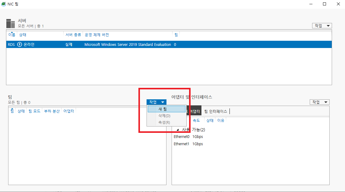 2) NIC팀 창이 뜨면 "작업" 버튼을 눌러 "새 팀"을 선택합니다.